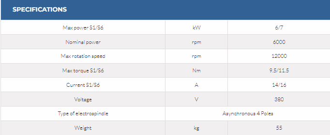 Electrospindle for stone and glass processing with high-speed asynchronous motor. Ideal for milling, drilling, cutting out, polishing, bevelling and engraving. Compact design to be installed on CNC machines with vertical plane (drills), horizontal and robots.